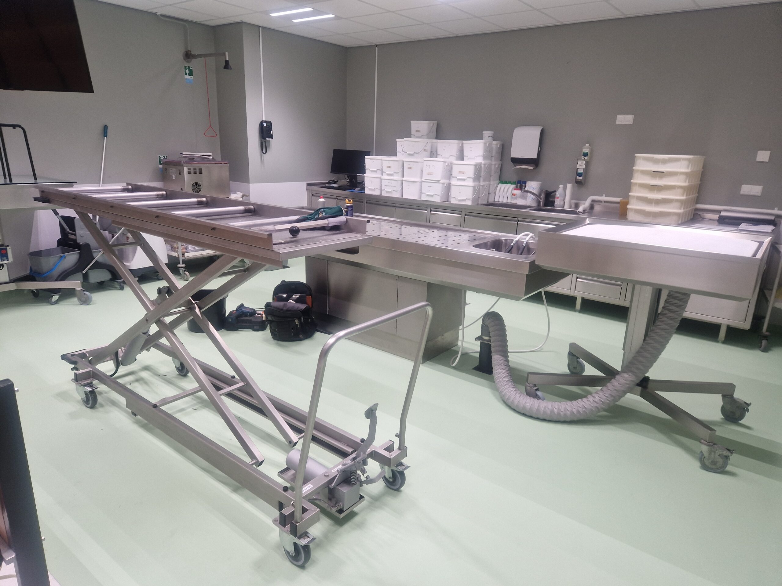 Het onderhoud van hefwagens in het mortuarium van ziekenhuizen.